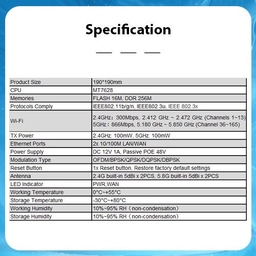 Wi-Fi: 2.4GHz:300Mbps, 2.412 GHz ~ 2.472 GHz (Channels 1~13) 5GHz:866Mbps, 5.180 GHz ~ 5.850 GHz (Channel 36~165)