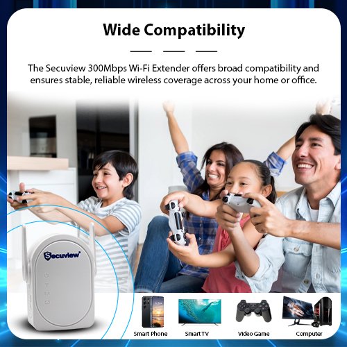 Wide Compatibility: The Secuview 300Mbps Wi-Fi Extender offers broad compatibility and ensures stable, reliable wireless coverage across your home or office.