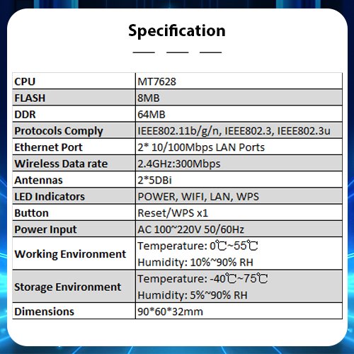 Protocols Comply: IEEE802.11b/g/n, IEEE802.3, IEEE802.3u