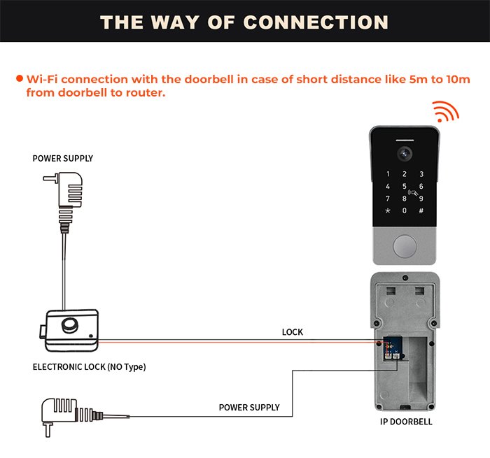 2 ways of Connection: Wi-Fi connection in case of short distance from the doorbell to the router; wired connection in case of long distance from the doorbell to the router.