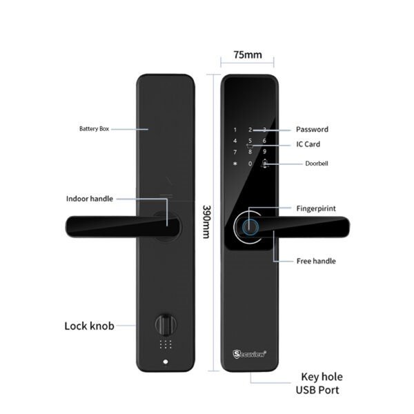 Unlocking Methods: Mobile App, password, fingerprint, card, key, and Temporary Password.