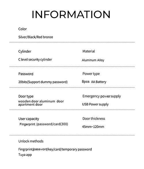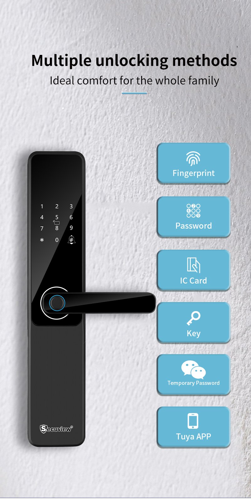 Multiple unlocking methods:Â Fingerprints, password, RF card, mechanical key, Tuya app, and temporary password.