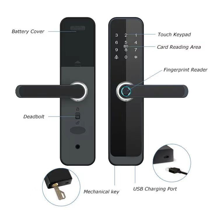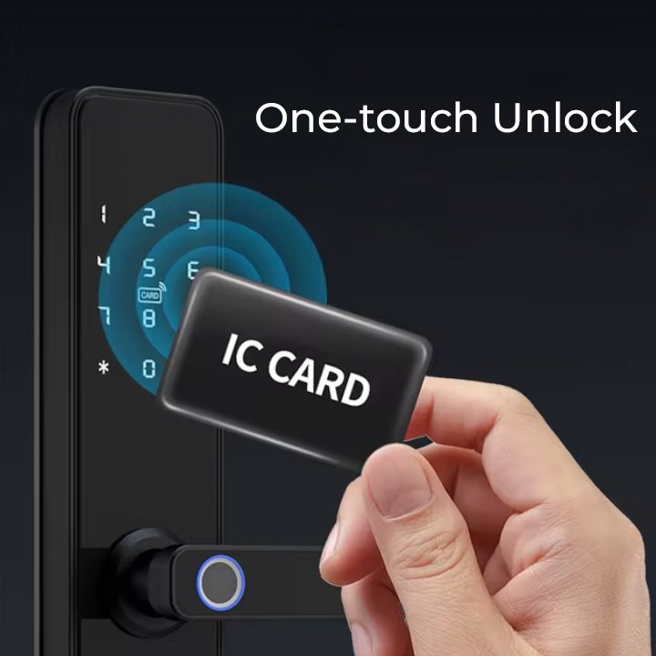 Unlocking methods: Password, fingerprint, RF card, key and mobile App, including temporary password.