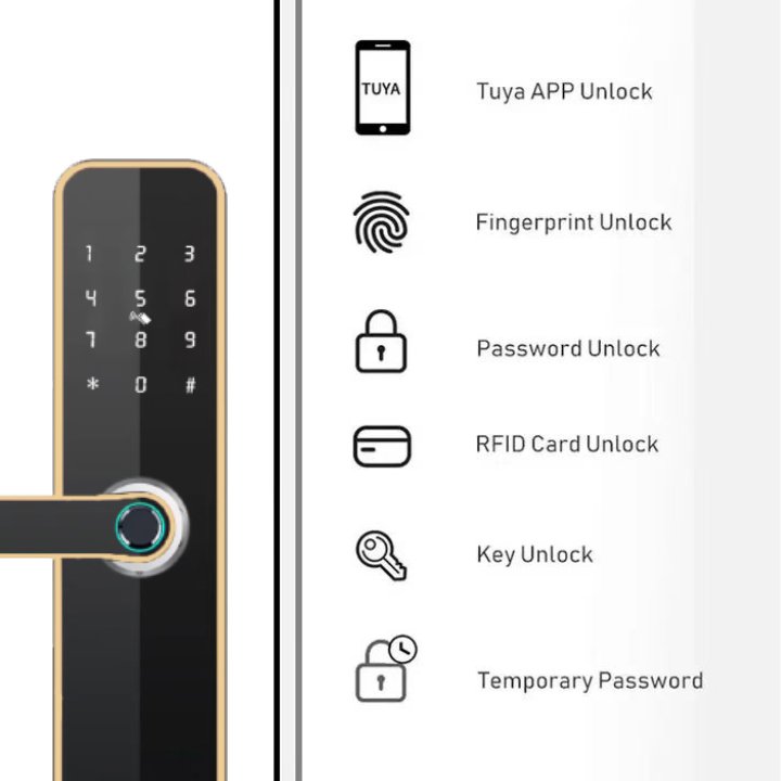 Multiple unlocking methods are available: Fingerprints, passwords, RF cards, mechanical keys, and the Tuya app, including temporary passwords.